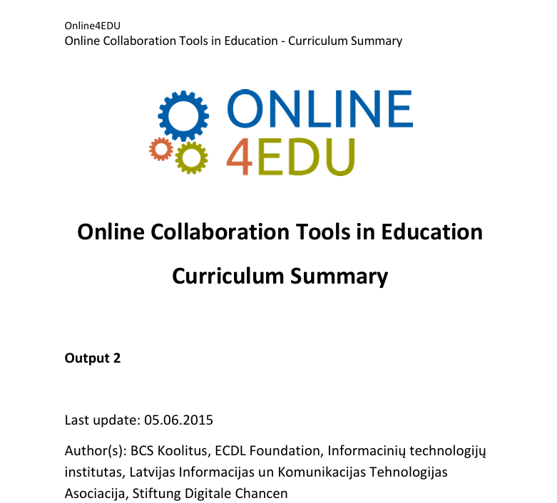 Im Rahmen des durch die EU geförderten Projektes Online4EDU wurde das Curriculum erstellt, um Lehrkräften den Umgang mit und den Nutzen von Anwendungen zur Online-Zusammenarbeit für den Lehralltag zu vermitteln. Die Summary zeigt die Lernziele des Curriculums auf. Dies ist die Deutsche Version.