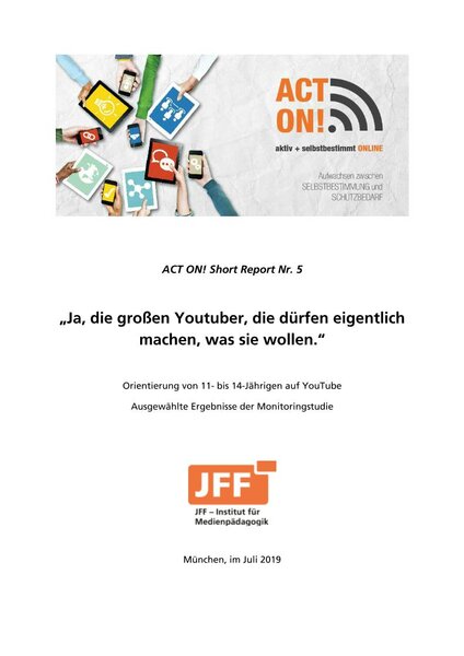 Welche Orientierung geben YouTube-Stars und welche Anreize gibt die beliebte Online-Plattform 11- bis 14-Jährigen? Mit diesen Fragen beschäftigt sich der fünfte Act On! Report des JFF - Institut für Medienpädagogik in Forschung und Praxis. Der Schwerpunkt liegt dabei auf den drei Bereichen: Kenntnisse der Jugendlichen über Funktionen der Plattform, Wissen über den kommerziellen Charakter von YouTube-Kanälen, persönliche Orientierung an YouTube-Stars. Die Ergebnisse der Befragung zeigen, welche YouTube-Kanäle für Jugendliche wichtig sind und welche Eigenschaften sie an ihren Vorbildern aus dem Netz besonders schätzen. Zudem zeigt der Report auf, welche Strategien der Publikumsbindung Heranwachsende bei YouTube-Stars durchschauen und was sie motiviert, einen eigenen YouTube-Kanal zu bespielen. Auch wird im Report deutlich, welches Verständnis die befragten Jugendlichen für die auf der Plattform geltenden Regeln haben.