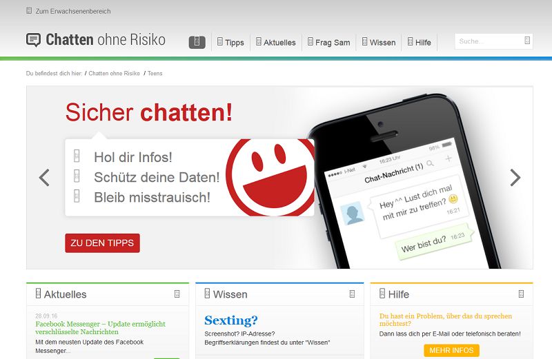 Auf der Webseite „Chatten ohne Risiko“ werden aktuelle Themen für Jugendliche aufbereitet, Begriffe erklärt, Meldestellen vorgestellt und Tipps zum Datenschutz gegeben. Die Seite unterstützt Jugendliche beim sicheren Chatten in Sozialen Netzwerken oder per Instant Messenger.
