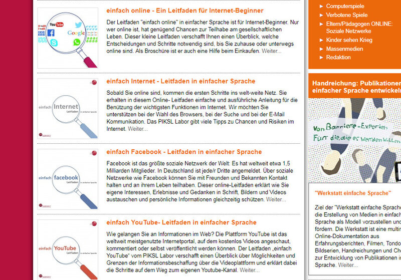 Die Bundeszentrale für politische Bildung bietet online zugängliche Leitfäden zum Thema „Internet“, „Soziale Netzwerke“, „Facebook“, „YouTube“ und „WhatsApp“. Die Reihe richtet sich konkret an Menschen, die noch keine Erfahrungen mit dem Internet gemacht haben. So sind die Leitfäden niedrigschwellig und in einfacherer Sprache gestaltet. Ziel der Broschüren ist es, zukünftigen Nutzerinnen und Nutzern einen Überblick zu verschaffen, welche Entscheidungen und Schritte notwendig sind, um online zu gehen und damit an der digitalen Welt teilzuhaben. Hierfür bieten, die auch als PDF verfügbaren, Leitfäden sehr ausführliche Schritt-für-Schnitt-Anleitungen. Zur Unterstützung besonders schwieriger Inhalte werden zudem Erklärfilme eingebunden, wie beispielsweise zur Funktion und Installation des Browsers oder dem Einrichten von einem sicheren Passwort.