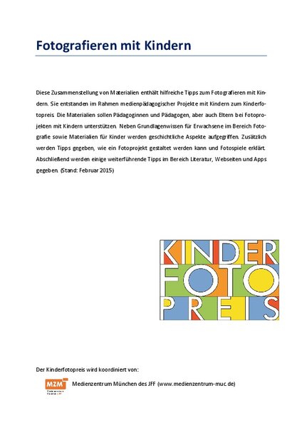 Die Broschüre enthält wichtige Tipps zum Fotografieren mit Kindern. Die Tipps sind im Rahmen medienpädagogischer Projekte mit Kindern zum Kinderfotopreis entstanden. Neben Grundlagenwissen für Erwachsene im Bereich Fotografie werden geschichtliche Aspekte aufgegriffen, Tipps gegeben, wie ein Fotoprojekt gestaltet werden kann, und Fotospiele erklärt. Zum Schluss gibt es noch Tipps zu weiterführenden Literatur, Webseiten und Apps. Außerdem kann das Buch „Fototipps für Kids“ heruntergeladen und zum Mitnehmen für unterwegs zusammengebastelt werden.