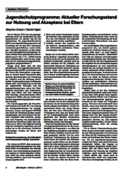 Das Hans-Bredow-Institut für Medienforschung hat Ende 2011 den Stand der Forschung über Kenntnis, Akzeptanz und Nutzung von Jugendschutzprogrammen im Elternhaus zusammen getragen. Die Ergebnisse dieser Forschung finden Sie im vorliegenden Bericht.