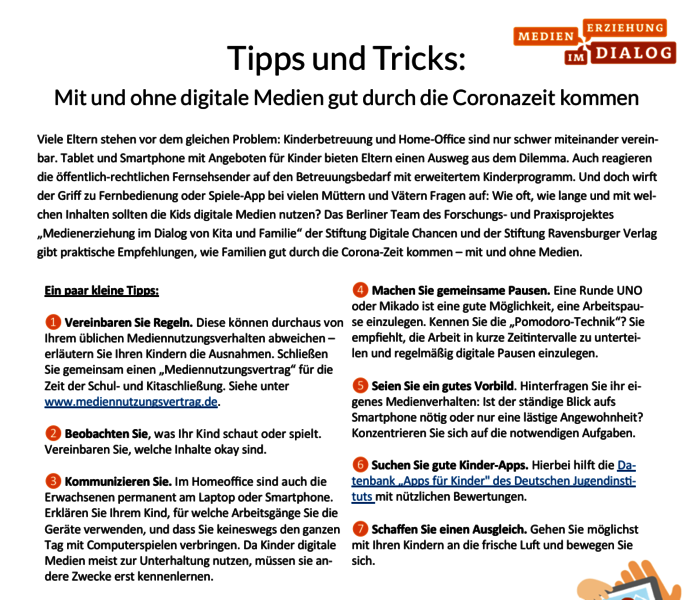 Infosheet für Kitas mit hilfreichen Tipps an die Eltern, wie sie gut mit und ohne digitale Medien durch die Coronazeit kommen